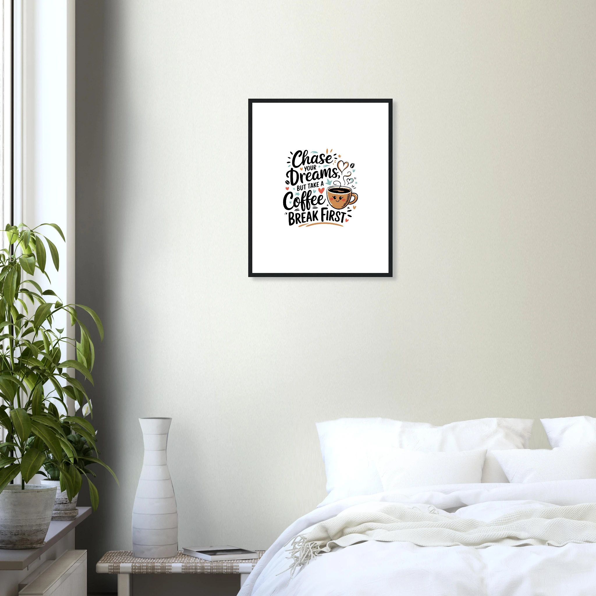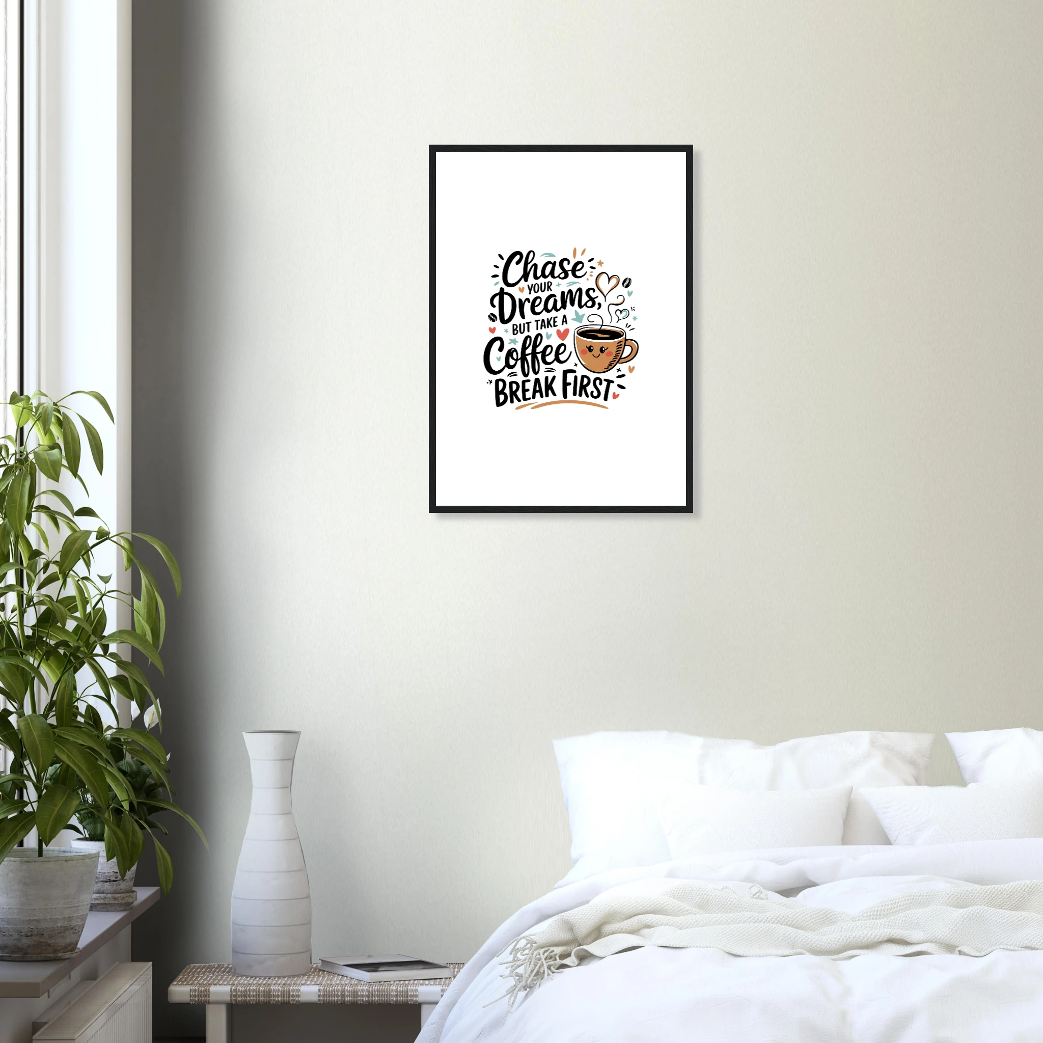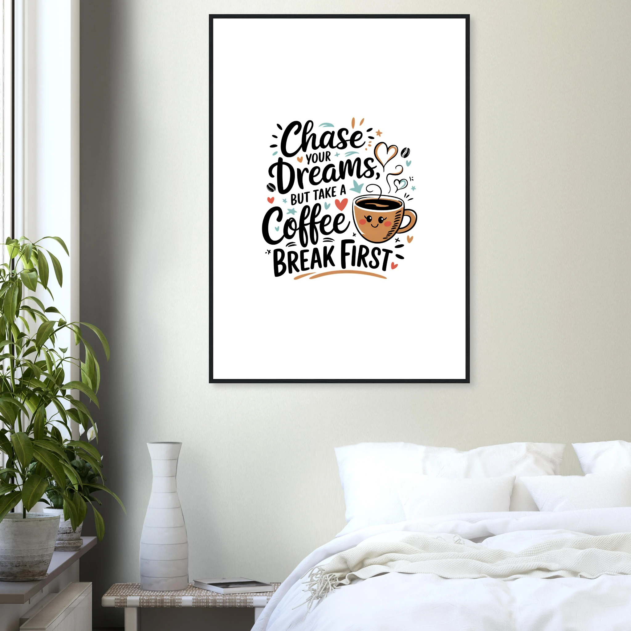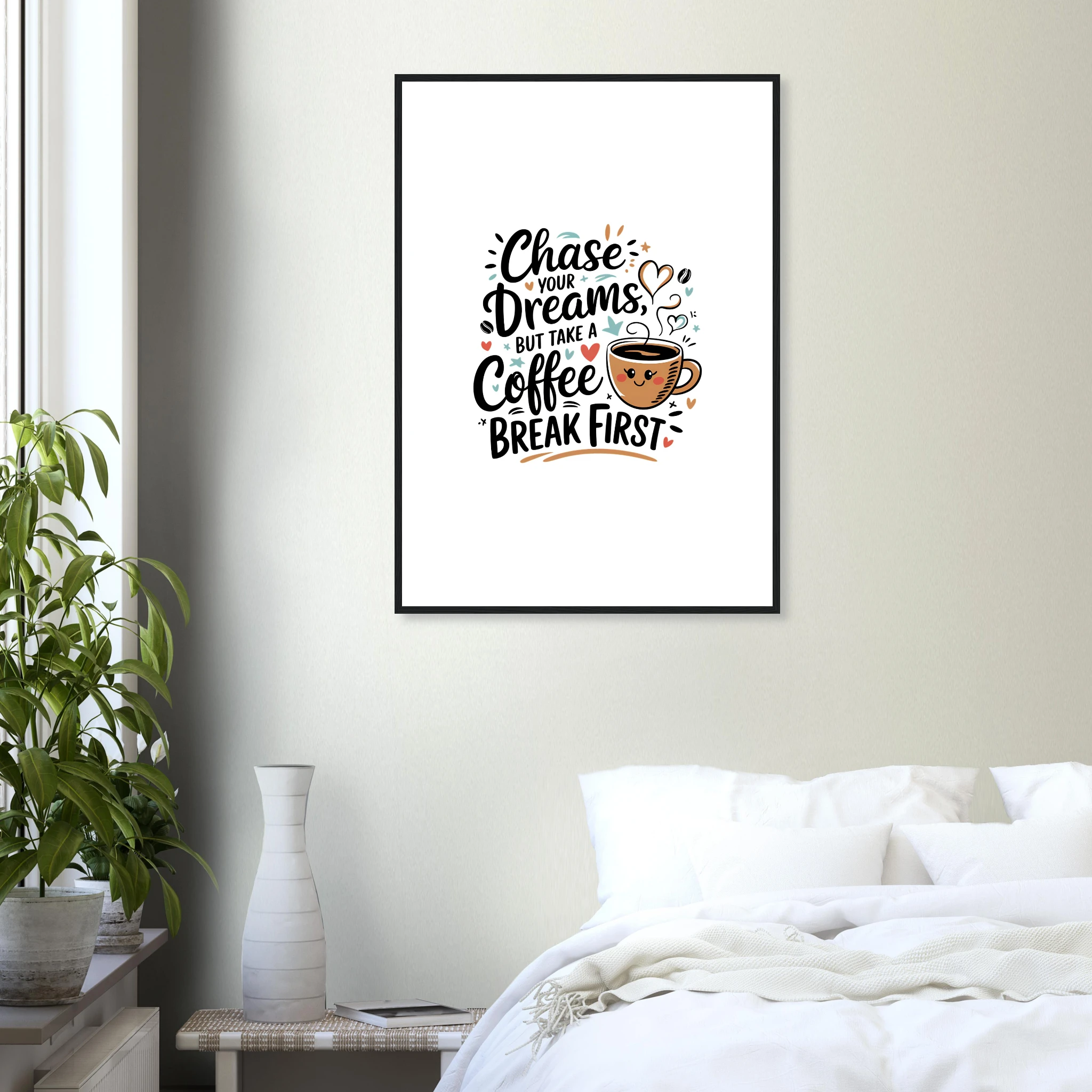 Transform your space with our stunning ‘Chase Your Dreams But Take A Coffee Break First’ Framed Poster. This piece of art not only inspires but also adds a touch of elegance to any room. Printed on heavyweight white matte paper with a luxurious finish, it’s designed to stand the test of time and make a statement.