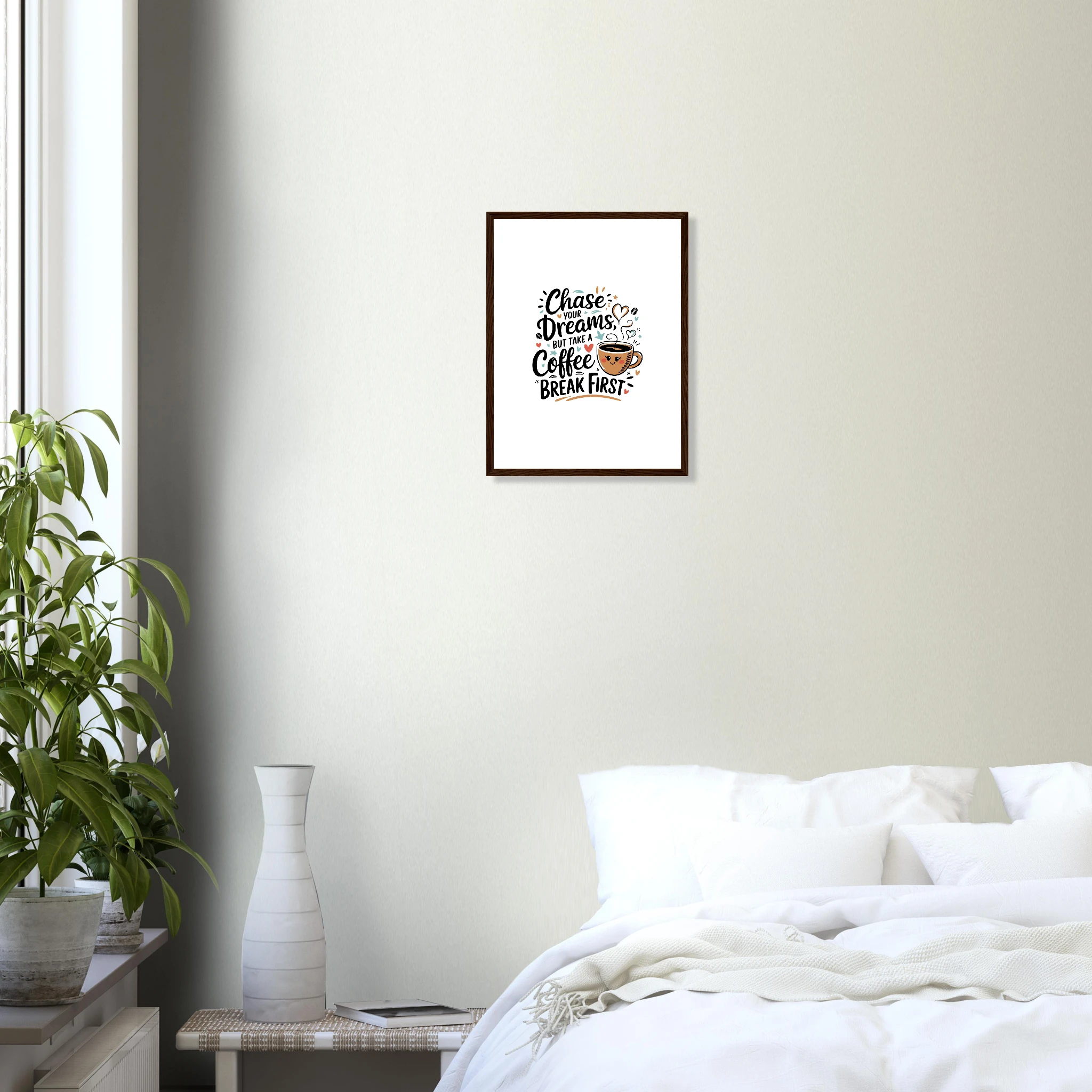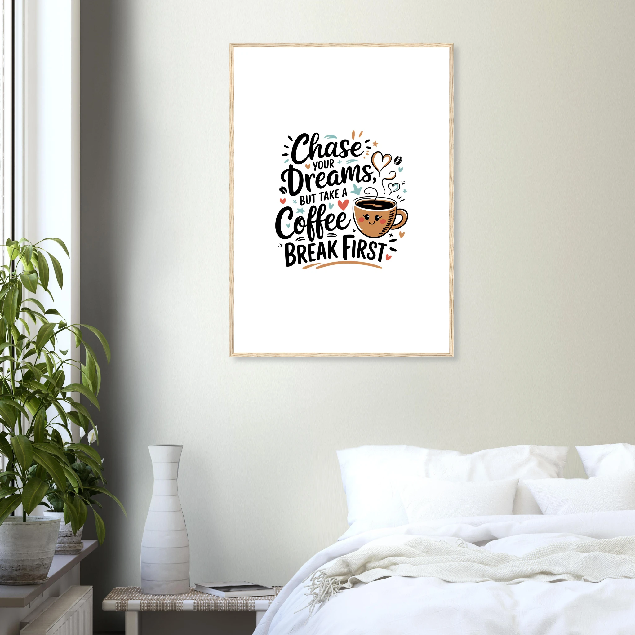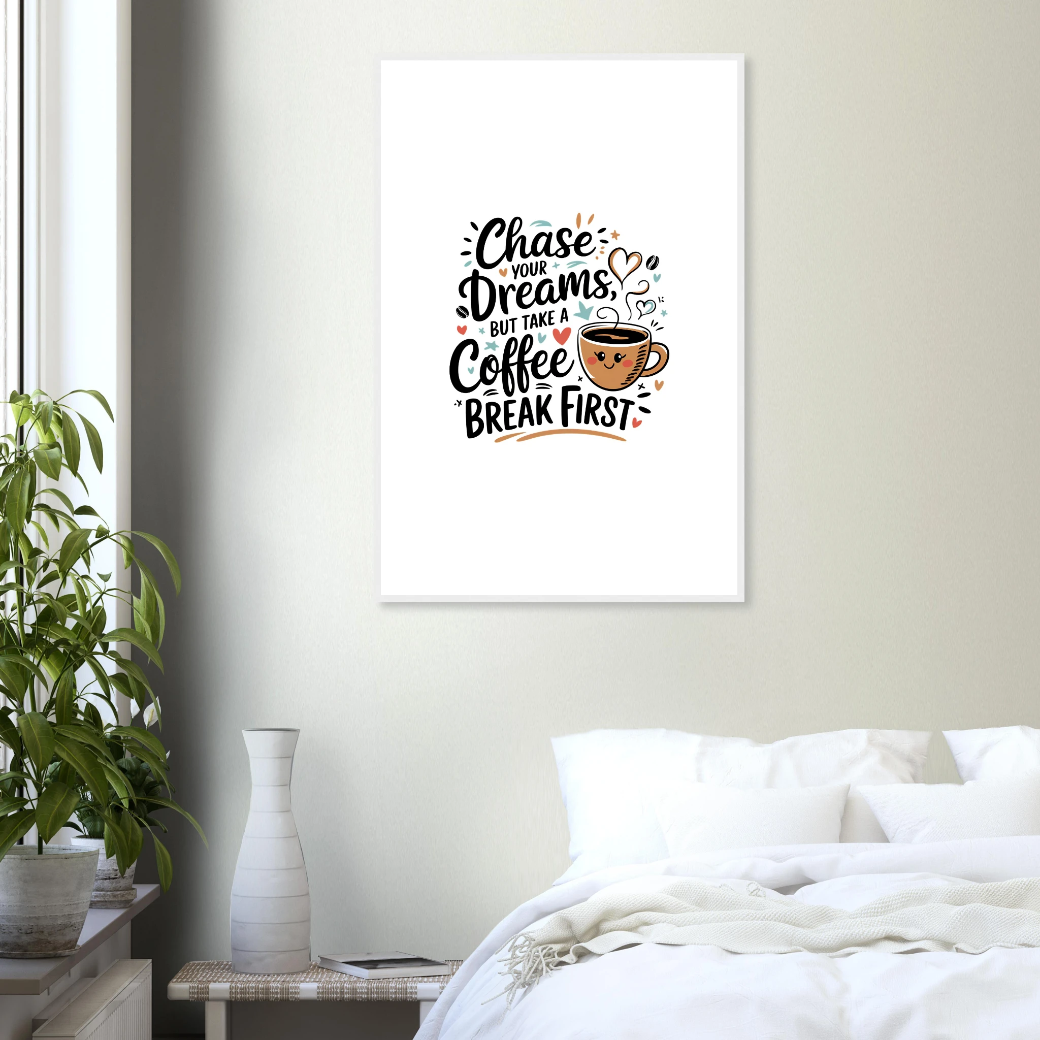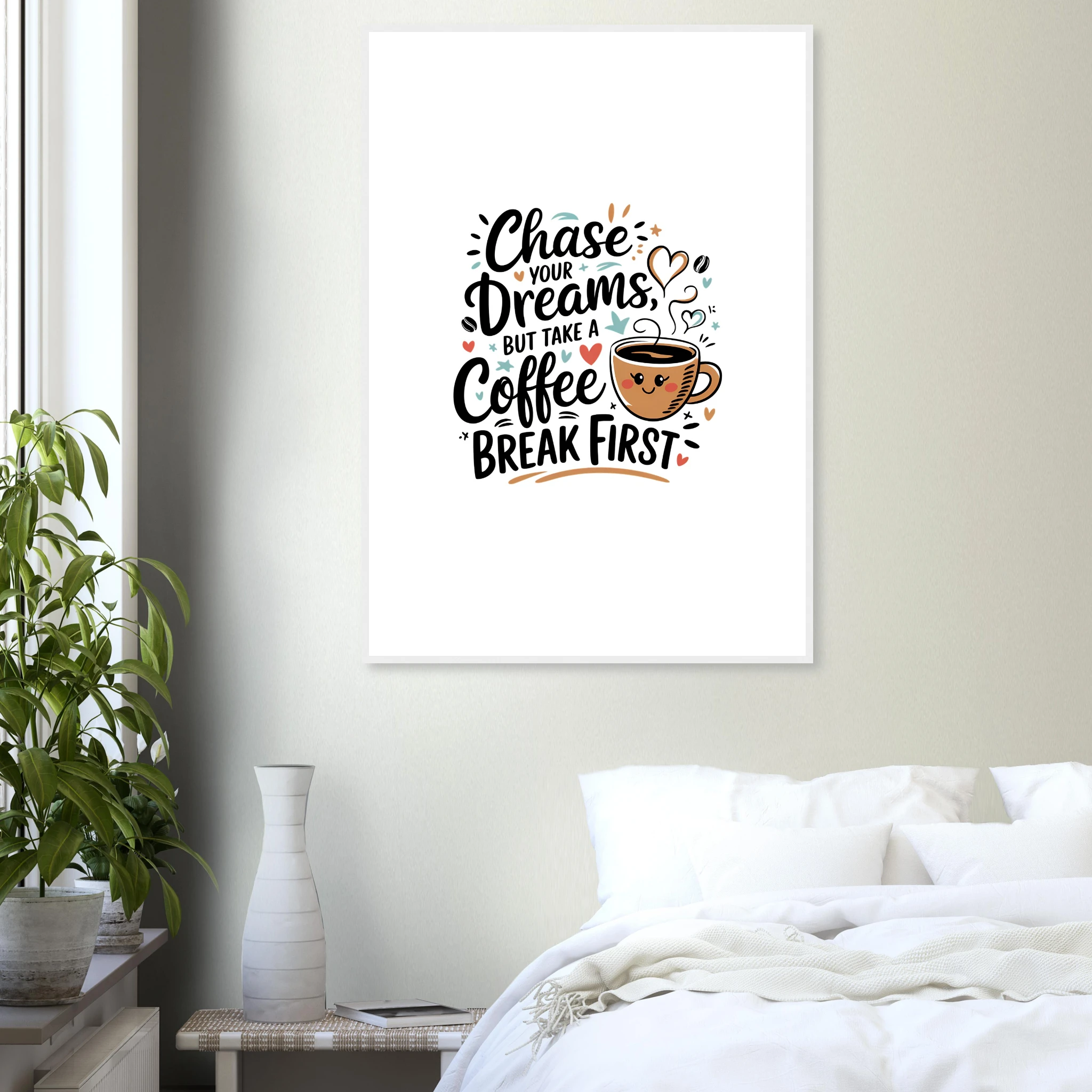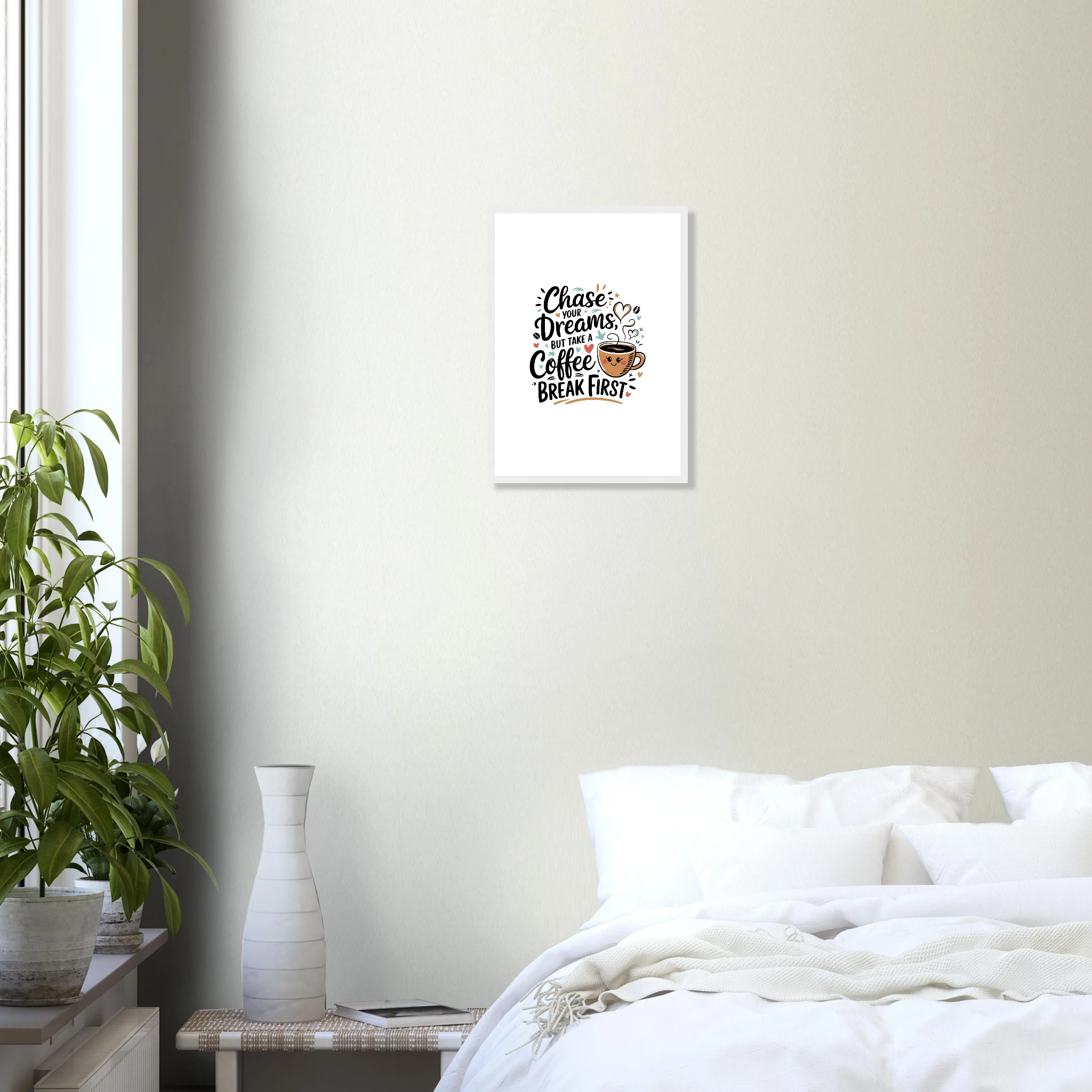 Transform your space with our stunning ‘Chase Your Dreams But Take A Coffee Break First’ Framed Poster. This piece of art not only inspires but also adds a touch of elegance to any room. Printed on heavyweight white matte paper with a luxurious finish, it’s designed to stand the test of time and make a statement.