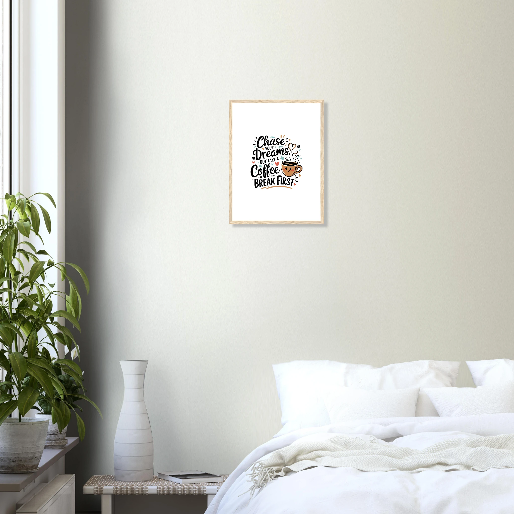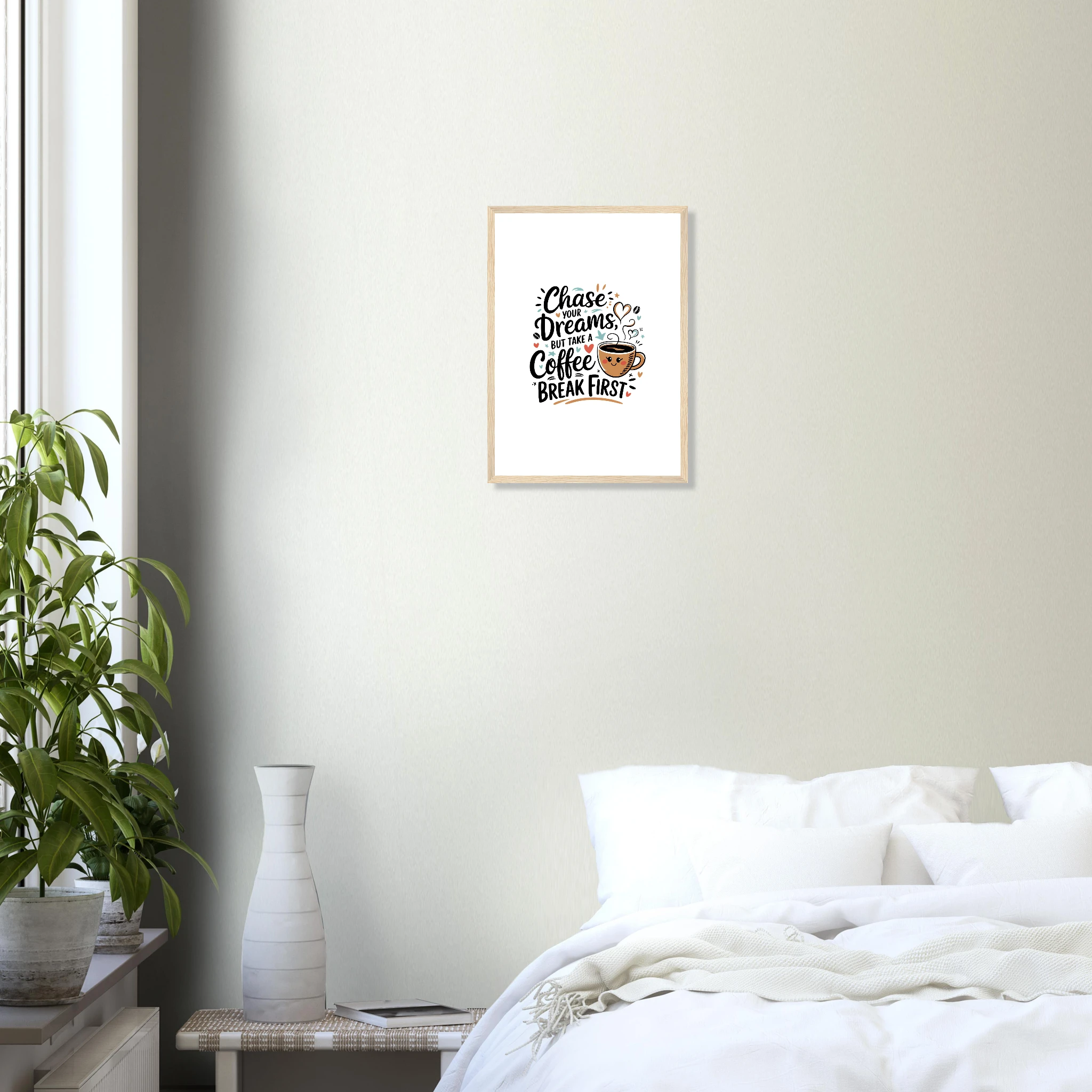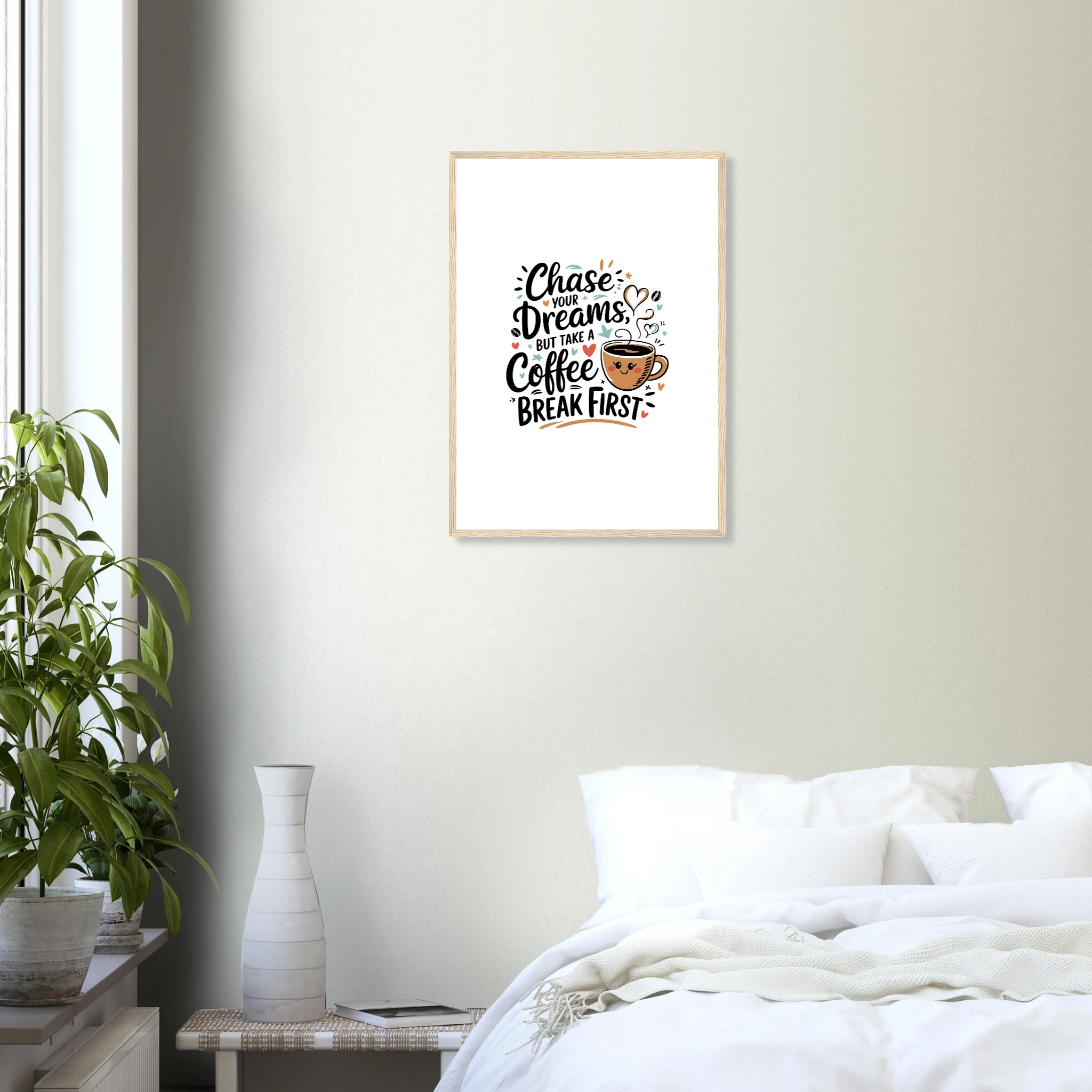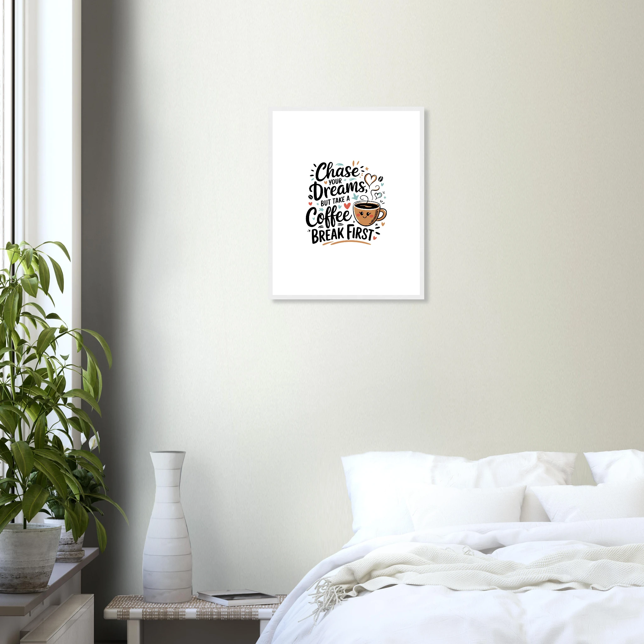 Transform your space with our stunning ‘Chase Your Dreams But Take A Coffee Break First’ Framed Poster. This piece of art not only inspires but also adds a touch of elegance to any room. Printed on heavyweight white matte paper with a luxurious finish, it’s designed to stand the test of time and make a statement.